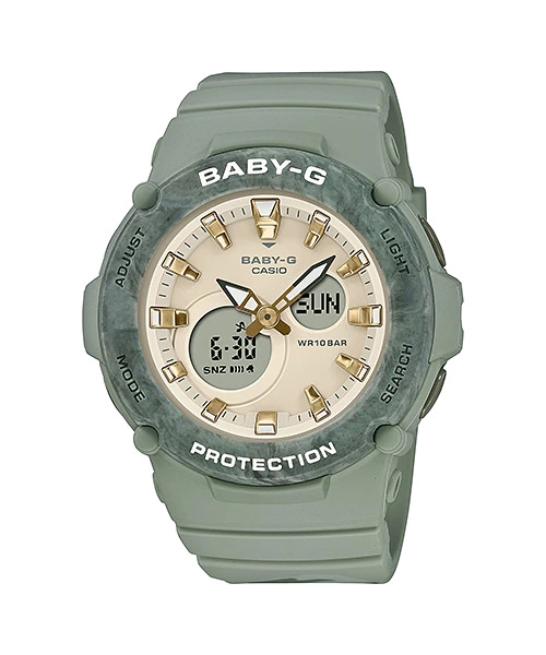 | توضیحات بیشتر | جنس بدنه / قاب: رزینبند رزینشبنما (Neobrite)مقاوم در برابر ضربهشیشه معدنیمقاومت در برابر آب تا عمق 100 متریچراغ LED (Super Illuminator)پستابزمان جهانی29 منطقه زمانی (48 شهر + ساعت هماهنگ جهانی)، روشن/خاموش کردن ساعت تابستانیکرونومتر 1/100 ثانیهایظرفیت اندازهگیری: 23:59'59.99''حالتهای اندازهگیری: زمان سپریشده، زمان مقطعی، زمانهای جایگاه اول و دومتایمر شمارش معکوسواحد اندازهگیری: 1 ثانیهدامنه شمارش معکوس: 24 ساعتمحدوده تنظیم زمان شروع شمارش معکوس: 1 دقیقه تا 24 ساعت (فواصل زمانی 1 دقیقهای و 1 ساعتی)5 آلارم روزانه (با 1 آلارم تعویق)سیگنال زمان ساعتینواخت عملکرد دکمه روشن/خاموشقالب 12/24 ساعتهتقویم تمام خودکار (تا سال 2099)وقتنمای معمولیآنالوگ: 2 عقربه (ساعتشمار، دقیقهشمار (عقربه هر 20 ثانیه حرکت میکند))دیجیتال: ساعت، دقیقه، ثانیه، ب.ظ، ماه، تاریخ، روزدقت: ±30 ثانیه در ماهعمر تقریبی باتری: 3 سال با باتری SR726W × 2 |