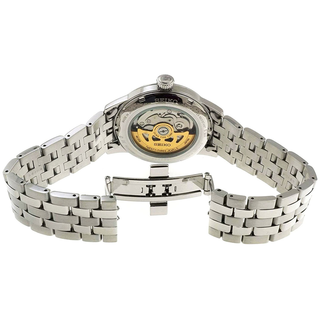 ساعت مچی سیکو مدلSSA439J1سیکو، یک برند معروف و محبوب در زمینه ساعتهای مچی و تجهیزات وابسته به آن می باشد. این شرکت در سال 1881 توسط البرتو سیکو در شهر کوماتو، ژاپن تأسیس شد و از پیشتازان صنعت ساعت سازیست.طراحیهای ساعتهای سیکو اغلب ساده، کلاسیک و البته زیبا هستند. به صورتی است که با طراحیهای مدرن و کلاسیک هماهنگی دارند.ساعتهای سیکو تلفیق هنر، دقت و نوآوریست. سیکو نمادی از زمان و یک علامت شناخته شده از سلیقه و اعتبار است.هر محصول، یک داستان منحصر به فرد از زمان و ذوق طراحی را با خود به ارمغان میآورد. از جنسها و مواد برتر تا طراحیهای شگفتانگیز، هر ساعت سیکو به عنوان یک اثر هنری برجسته شناخته میشود. همچنین، فناوریهای پیشرفته و دقت فوقالعاده در ساعتهای سیکو اطمینان میدهند که شما همواره در کنترل زمان خود باشید.با مجموعهای از ساعتهای متنوع و جذاب، سیکو تجربهای فوقالعاده از زمان و استایل را برای شما فراهم میکند. اکنون، با محصولات سیکو، زمان را به یک سفر استثنایی از زیبایی و علم تبدیل کنید.Seiko Presage، سری ساعت های مچی است که به مناسبت ۱۱۰ همین سالگرد افتتاح، توسط شرکت ساعت سازی ژاپنی Seiko معرفی گردید و تولید می شود. سری Presage ترکیبی از هنر سنتی ژاپن که با طراحی معاصر و فناوری پیشرفته می باشد. مدل های این ساعت ماسب برای مراسم رسمی و استفاده لوکس هستند.ویژگی های کلیدی ساعت مچی سیکو مدل SSA439J1جنس قاب: استیلجنس بند: استیلجنس شیشه: هاردلکستکنولوژی موتور: اتوماتیک