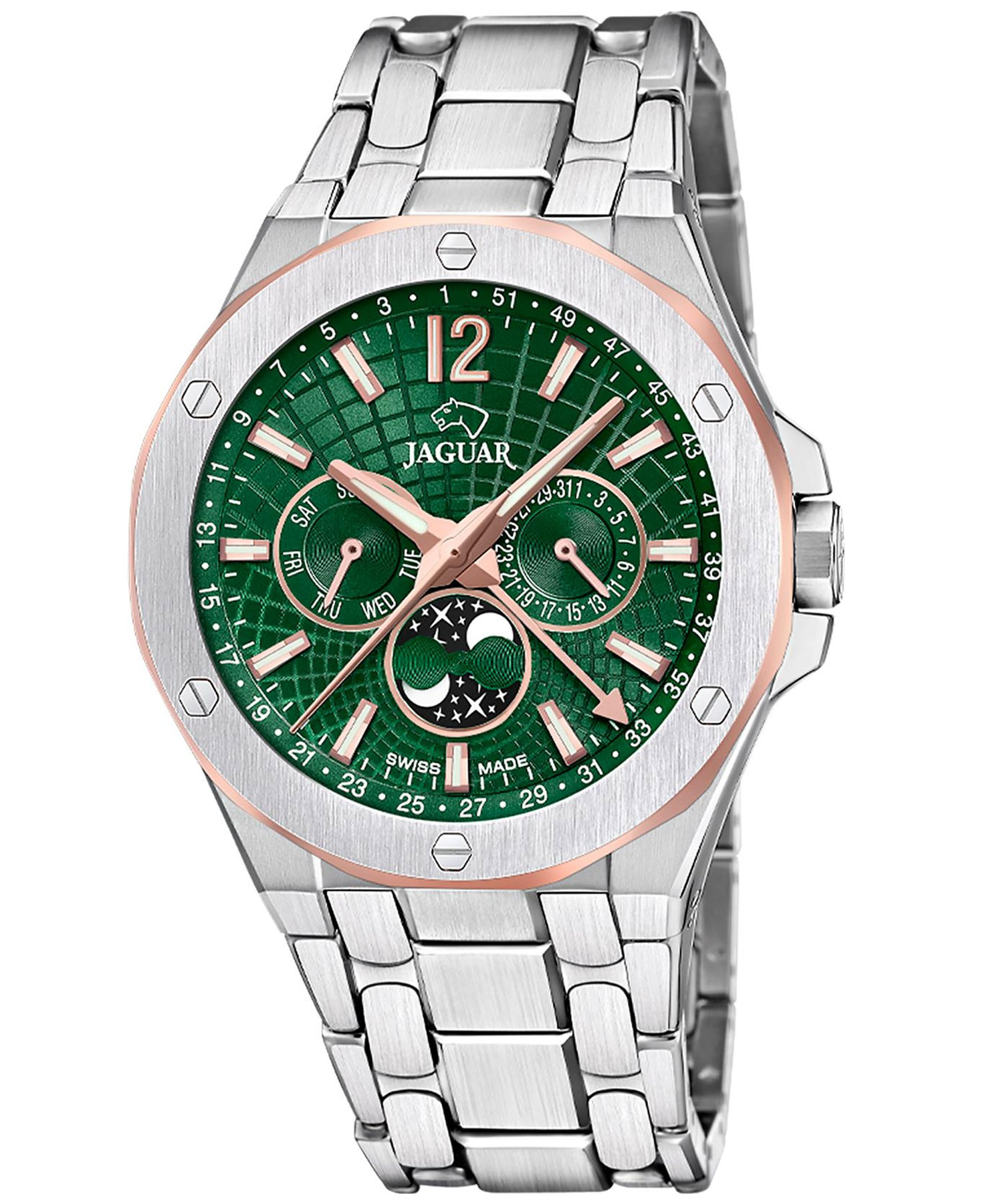 دسته: jaguar, آنالوگ, بند نقره ای, تعداد موتور, جنس بند, جنس قاب, رنگ بند, رنگ صفحه, رنگ قاب, ساعت بر اساس برند, ساعت بر اساس جنسیت, سوییس, صفحه سبز, مبدا برند, مردانه, نوع ساعت, یک موتور