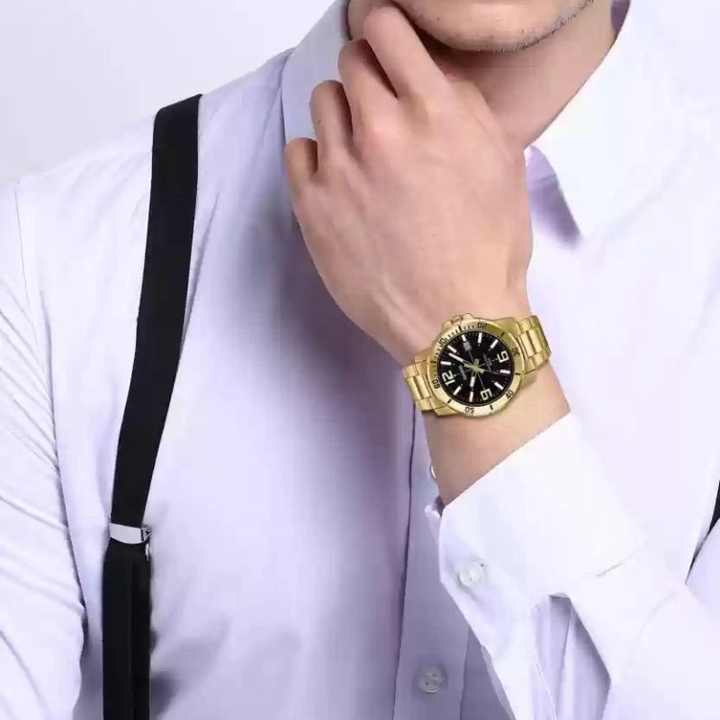 بدنه و بند با پوشش یون طلایی و آبکاری یونیزمانسنجی منظم آنالوگ: 3 عقربه (ساعت، دقیقه و ثانیه) |