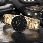 | سایر ویژگی ها | بند و بدنه با پوشش یون طلاییزمانسنجی منظم آنالوگ: 3 عقربه (ساعت، دقیقه و ثانیه) |