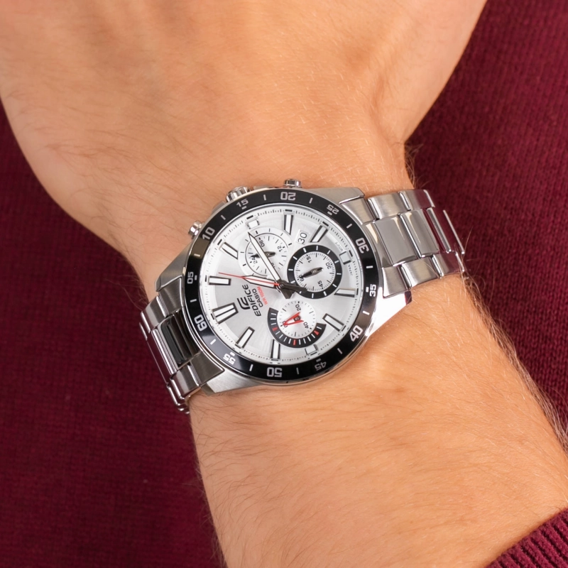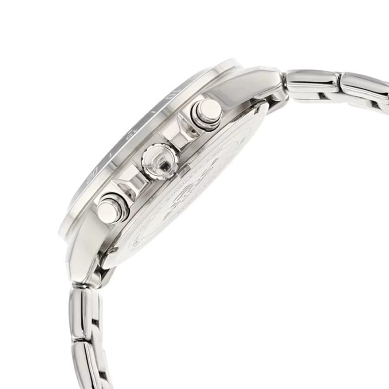 عضو کلکسیون Standard Chronograph از سری ساعتهای EDIFICEزمانسنجی منظم شامل سه عقربه ثانیه، دقیقه و ساعتشمار (دو عقربه دقیقه و ساعتشمار شبتاب)صفحه دارای سه بخش برای نمایش زمان به فرمت 24 ساعته و نمایش ثانیه و دقیقه کرنومترقاب پشتی به راحتی باز میشود |