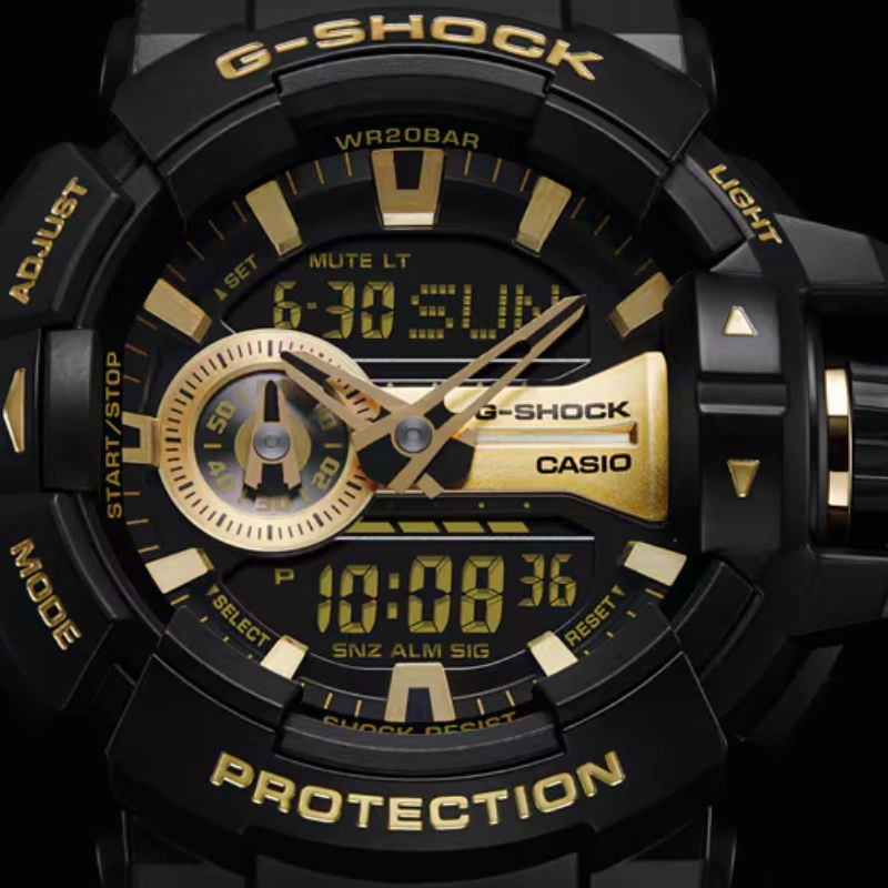 سری GA-400فرمت 12/24 ساعتهویژگی جابهجایی عقربهها (عقربهها به کنار میروند تا نمایی بدون مانع از محتوای نمایش دیجیتال فراهم شود)زمانسنجی منظم:آنالوگ: 2 عقربه ساعتشمار، دقیقهشمار (عقربه هر 20 ثانیه حرکت میکند)، 1 نمایشگر (دقیقهشمار معکوس)دیجیتال: ساعت، دقیقه، ثانیه، عصر، ماه، تاریخ، روز |