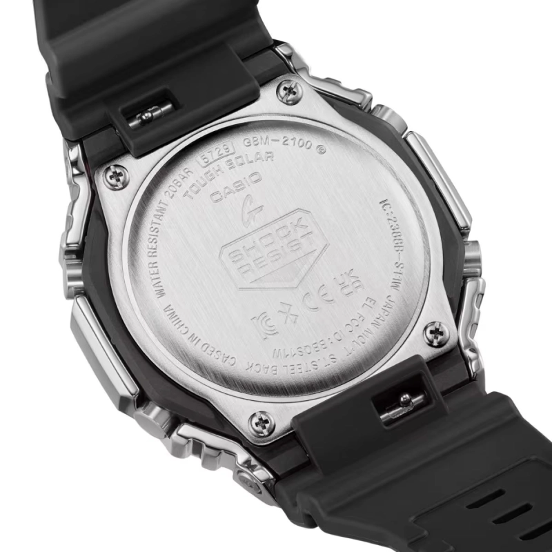 نسخه G-STEEL از سری ساعت‌های GBM-2100 از جیشاکعقربه‌های آنالوگ به‌طور خودکار کنار می‌روند تا نمایشگر دیجیتال واضح‌تر دیده شودفرمت 12/24 ساعتهنمایش روز (روزهای هفته قابل انتخاب به شش زبان)زمان‌سنجی منظم:آنالوگ: ساعت، دقیقه (حرکت عقربه هر 20 ثانیه)/ 1 نمایشگر سطح باتری و حالتدیجیتال: ساعت، دقیقه، ثانیه، بعد از ظهر، ماه، تاریخ، روز