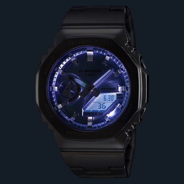 سری G-STEELفرمت 12/24 ساعتهویژگی جابهجایی عقربهها (عقربهها به کنار میروند تا نمایی بدون مانع از محتوای نمایش دیجیتال فراهم شود)زمانسنجی منظم:آنالوگ: 2 عقربه (ساعت، دقیقه (عقربه هر 20 ثانیه حرکت میکند))، 1 نمایشگر (روزهای هفته)دیجیتال: ساعت، دقیقه، ثانیه، عصر، ماه، تاریخ، روز |