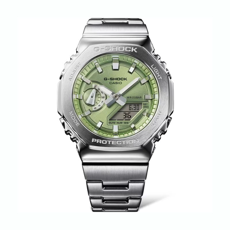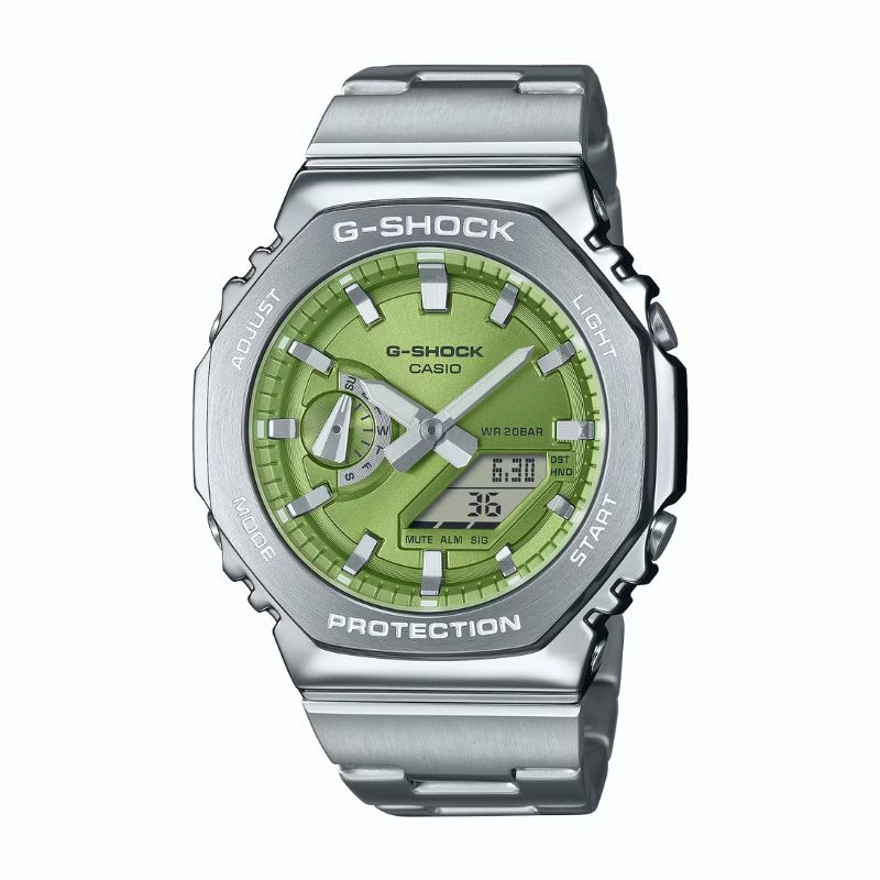 سری G-STEELفرمت 12/24 ساعتهویژگی جابهجایی عقربهها (عقربهها به کنار میروند تا نمایی بدون مانع از محتوای نمایش دیجیتال فراهم شود)زمانسنجی منظم:آنالوگ: 2 عقربه ساعتشمار، دقیقهشمار (عقربه هر 20 ثانیه حرکت میکند)، 1 نمایشگر (روزهای هفته)دیجیتال: ساعت، دقیقه، ثانیه، عصر، ماه، تاریخ، روزهای هفته |
