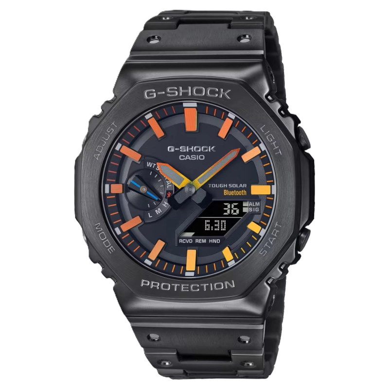 نسخه سالگرد 40 سالگی سری G-SHOCK – سری 2100 از کلکسیون FULL METALصفحه ساعت دارای گرادیان رنگین کمان در بخش‌های متفاوتبدنه و بند دارای روکش آیون به رنگ مشکیاتصال به تلفن همراه از طریق بلوتوث (به همراه قابلیت Find your phone)باتری خورشیدی با فناوری Tough Solarعقربه‌های شب‌تاببه راحتی در شب دیده می‌شود (فناوری Neobrite)نمایش زمان با فرمت 12/24 ساعتهنشان‌دادن میزان شارژ باقیمانده7 ماه شارژدهی با استفاده عادی (پس از شارژ کامل)18 ماه شارژدهی در حالت ذخیره انرژی (پس از شارژ کامل)دسترسی به زمان بیش از 300 شهر و بروزرسانی خودکار زمان (در صورت لینک‌شدن با نرم‌افزار)پیدا کردن تلفن همراه با فشردن یک دکمه ساعتایجاد کردن آلارم یادآوریتنظیمات ساده (از طریق نرم افزار)تنظیم خودکار ساعتقاب فلزی پشت ساعت با چرخش باز می‌شود (تعمیرات آسانتر)قابلیت جابجایی عقربه برای ایجاد دید بهتر از صفحه دیجیتالقابلیت جابجایی نمایش تاریخ و ماه در صفحه دیجیتالنمایش روز (پشتیبانی از 6 زبان متفاوت)صفحه آنالوگ: دو عقربه ساعت و دقیقه (هر 20 ثانیه حرکت می‌کند) – بخش نمایش میزان باتری یا حالتصفحه دیجیتال: نمایش ساعت، دقیقه، ثانیه، روز و شب، ماه، تاریخ و روز