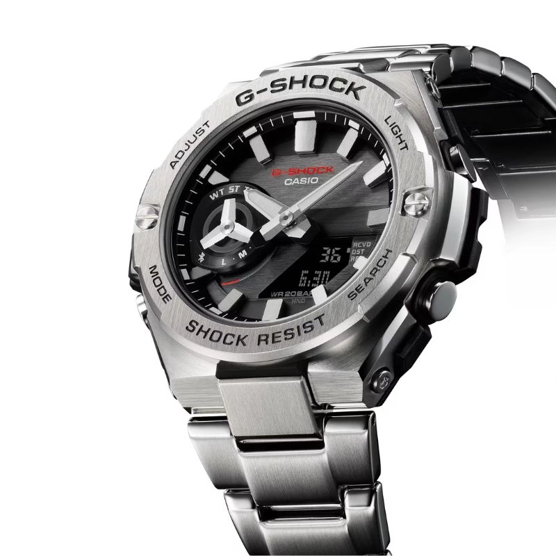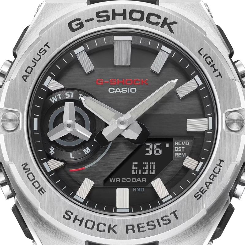 G-STEEL سری GST-B500ساختار محافظ هسته کربنیویژگی جابجایی عقربهها: عقربهها از جلوی دید کنار میروند تا نمایی بدون مانع از محتوای نمایش دیجیتال فراهم شودفرمت 12/24 ساعتهتعویض نمایش تاریخ/ماهنمایش روزهای هفته (روزهای هفته قابل انتخاب به شش زبان)زمانسنجی منظم:آنالوگ: 2 عقربه ساعتشمار و دقیقهشمار (عقربه هر 20 ثانیه حرکت میکند), 1 نمایشگر (سطح باتری، مود)دیجیتال: ساعت، دقیقه، ثانیه، بعدازظهر، ماه، تاریخ، روز |