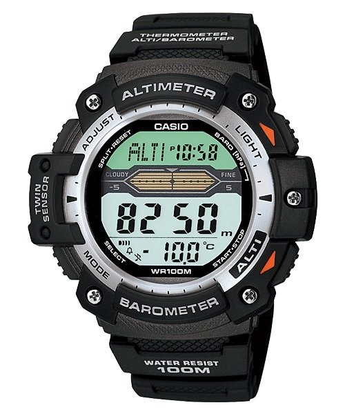 جنس بدنه / قاب: رزین / آلومینیومبند رزینشیشه رزینمقاومت در برابر آب تا عمق 100 متریچراغ LEDپستابارتفاع سنجمحدوده اندازهگیری: 700- تا 10,000 متر (-2300 تا 32,800 فوت) بدون ارتفاع مرجعواحد اندازهگیری: 5 متر (20 فوت)سایر موارد: تنظیمات ارتفاع مرجع*تغییر بین متر (m) و فوت (ft)بارومترمحدوده نمایش: 260 تا 1100 هکتوپاسکال (7.65 تا 32.45 اینچ جیوه)واحد نمایش: 1 هکتوپاسکال (0.05 اینچ جیوه)شاخص اختلاف فشار جو*تغییر بین هکتوپاسکال و اینچ جیوهدماسنجمحدوده نمایش: 10- تا 60 درجه سانتیگراد (14 تا 140 درجه فارنهایت)واحد نمایش: 0.1 درجه سانتیگراد (0.2 درجه فارنهایت)*تغییر بین سانتیگراد (°C) و فارنهایت (°F)زمان جهانی31 منطقه زمانی (48 شهر)، نمایش کد شهر، ساعت تابستانی روشن/خاموشکرونومتر 1/100 ثانیهایظرفیت اندازهگیری: 23:59'59.99''حالتهای اندازهگیری: زمان سپریشده، زمان مقطعی، زمانهای جایگاه اول و دومتایمر شمارش معکوسواحد اندازهگیری: 1 ثانیهمحدوده شمارش معکوس: 24 ساعتمحدوده تنظیم زمان شروع شمارش معکوس: 1 دقیقه تا 24 ساعت (افزایش 1 ساعتی و افزایش 1 دقیقهای)آلارم روزانه5 آلارم روزانه مستقلبوق ساعتیتقویم خودکار کامل (تا سال 2099)فرمت 12/24 ساعتهنواخت عملکرد دکمه روشن/خاموشوقتنمای معمولی: ساعت، دقیقه، ثانیه، ب.ظ، ماه، تاریخ، روزدقت: ±30 ثانیه در هر ماهعمر تقریبی باتری: 3 سال با باتری CR2016 |