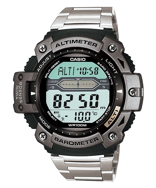 جنس بدنه / قاب: رزین / آلومینیومبند رزینشیشه رزینمقاومت در برابر آب تا عمق 100 متریچراغ LEDپستابارتفاع سنجمحدوده اندازهگیری: 700- تا 10,000 متر (-2300 تا 32,800 فوت) بدون ارتفاع مرجعواحد اندازهگیری: 5 متر (20 فوت)سایر موارد: تنظیمات ارتفاع مرجع*تغییر بین متر (m) و فوت (ft)بارومترمحدوده نمایش: 260 تا 1100 هکتوپاسکال (7.65 تا 32.45 اینچ جیوه)واحد نمایش: 1 هکتوپاسکال (0.05 اینچ جیوه)شاخص اختلاف فشار جو*تغییر بین هکتوپاسکال و اینچ جیوهدماسنجمحدوده نمایش: 10- تا 60 درجه سانتیگراد (14 تا 140 درجه فارنهایت)واحد نمایش: 0.1 درجه سانتیگراد (0.2 درجه فارنهایت)*تغییر بین سانتیگراد (°C) و فارنهایت (°F)زمان جهانی31 منطقه زمانی (48 شهر)، نمایش کد شهر، ساعت تابستانی روشن/خاموشکرونومتر 1/100 ثانیهایظرفیت اندازهگیری: 23:59'59.99''حالتهای اندازهگیری: زمان سپریشده، زمان مقطعی، زمانهای جایگاه اول و دومتایمر شمارش معکوسواحد اندازهگیری: 1 ثانیهمحدوده شمارش معکوس: 24 ساعتمحدوده تنظیم زمان شروع شمارش معکوس: 1 دقیقه تا 24 ساعت (افزایش 1 ساعتی و افزایش 1 دقیقهای)آلارم روزانه5 آلارم روزانه مستقلبوق ساعتیتقویم خودکار کامل (تا سال 2099)فرمت 12/24 ساعتهنواخت عملکرد دکمه روشن/خاموشوقتنمای معمولی: ساعت، دقیقه، ثانیه، ب.ظ، ماه، تاریخ، روزدقت: ±30 ثانیه در هر ماهعمر تقریبی باتری: 3 سال با باتری CR2016 |