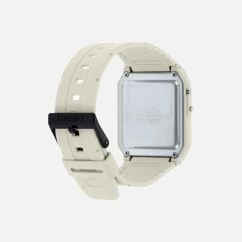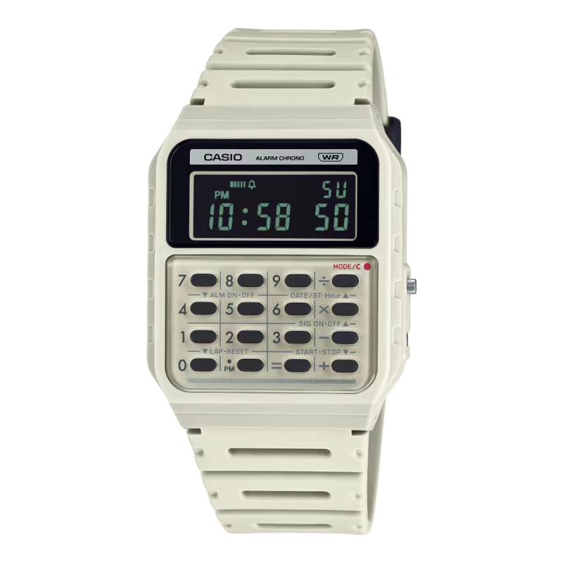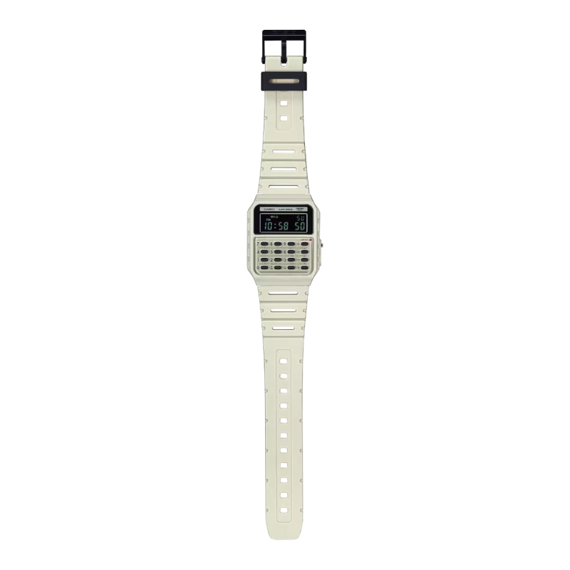 طراحی برگرفته از کاسیو مینی، اولین ماشین حساب شخصی در جهانماشین حساب 8 رقمیبند تهیه شده از مواد طبیعینمایش ساعت با فرمت 12/24 ساعته |
