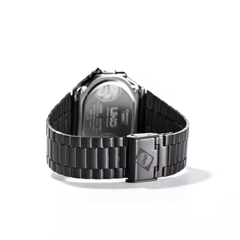 مدل Limited Edition همکاری با شرکت UNOدارای طراحی کلاسیک و برگرفته از کارتهای بازی UNOطراحی 4 رنگه دور صفحه دیجیتال، برگرفته از رنگهای کارتها در بازی UNOنمایانشدن کلمه WILD در پسزمینه صفحه دیجیتال هنگام روشنشدن نور صفحهبدنه و بند ساعت دارای روکش ایون (Ion) به رنگ مشکی هستندقاب پشت ساعت دارای حکاکی کارتهای بازی و لوگو UNOباکس بستهبندی ویژهقسمت فلزی قفل تنظیمشونده دارای حکاکی کارت بازی UNOفرمت 12/24 ساعتهنمایش روز هفته |